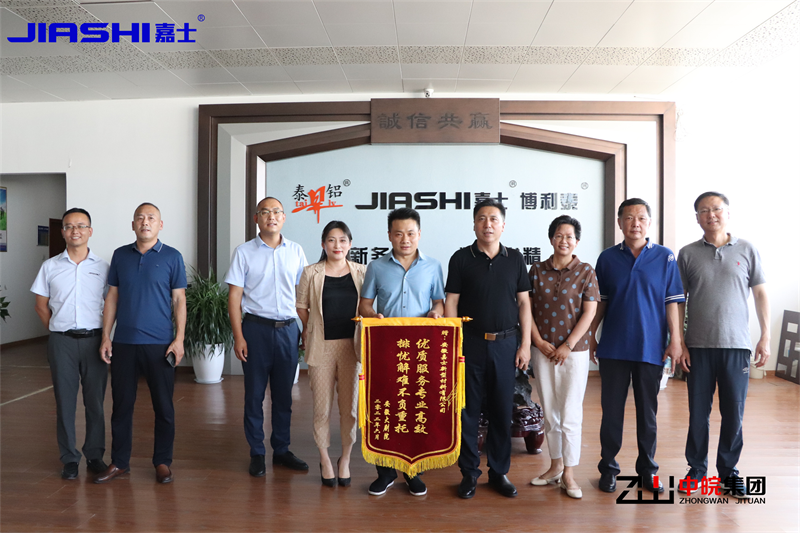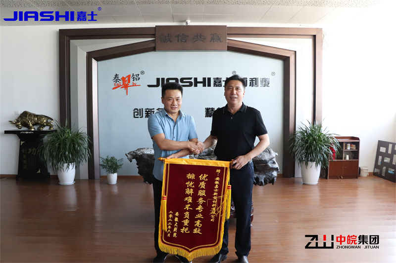 圖為安徽大劇院季總、張總等領(lǐng)導(dǎo)贈予中皖集團(tuán)-嘉士鋁單板的錦旗。